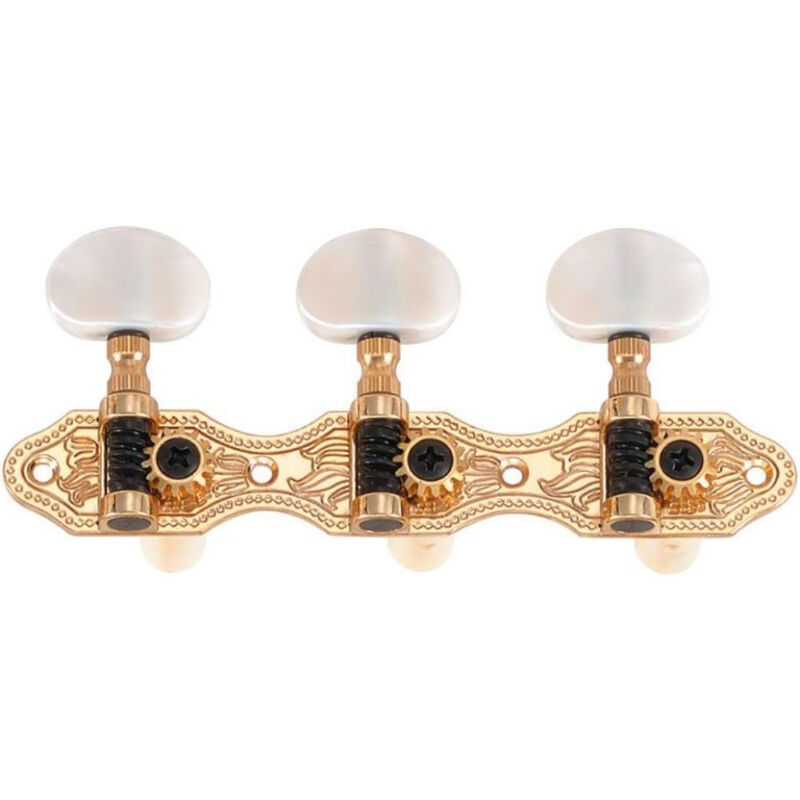• El Luthier JC405GK-A2W es un clavijero de guitarra clásica con acabado dorado y forma cóncaba con una palomilla ovalada y blanca.